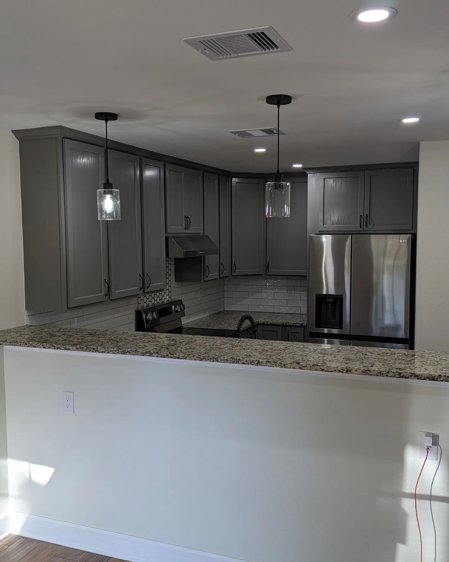 Custom cabinetry and countertop installations give you storage built around your dishes, not generic box dimensions. Tile work, backsplash installation, and flooring updates replace cracked grout and peeling vinyl with durable materials that handle spills and foot traffic. Lighting upgrades, layout redesigns, and appliance integration let you cook with task lighting over prep zones, LED strips under cabinets, and outlets positioned where you actually plug in mixers and blenders. Plumbing and electrical improvements for modern functionality include adding dishwasher circuits, upgrading faucet supply lines, and relocating sinks when your new layout calls for it. Full kitchen transformations from demo to final finishes cover everything from tearing out old cabinets to installing crown molding and under-cabinet lighting.